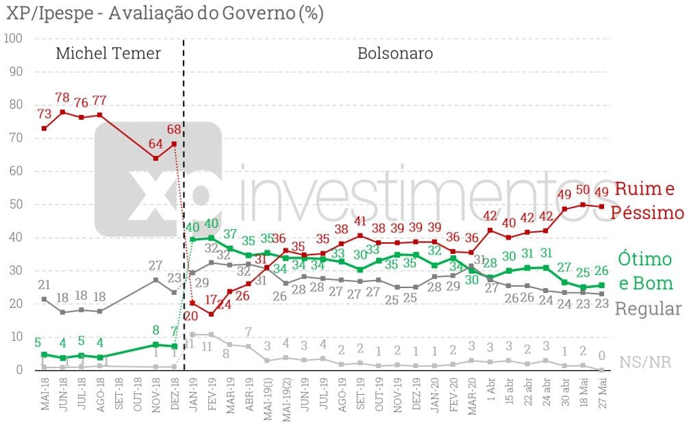 Dias após a divulgação do vídeo da reunião ministerial de 22 de abril e em meio ao acirramento das tensões entre os Poderes Executivo e Judiciário, uma nova rodada da pesquisa XP/Ipespe indicou uma interrupção na tendência negativa para o presidente Jair Bolsonaro (sem partido) junto à opinião pública.