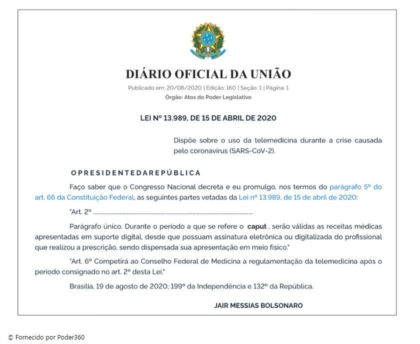 Os artigos que antes foram vetados, teve os seus vetos derrubados pelo Congresso Nacional, os artigos falam sobre o uso de receitas médicas digitais e da regulamentação da telemedicina depois da pandemia. A mudança foi publicada no Diário Oficial desta 5ª feira (20.ago.2020).